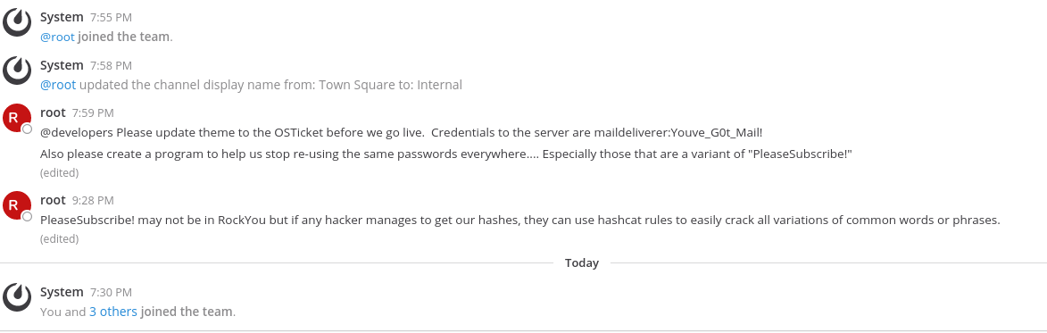 After logging in MatterMost I saw some messages from a user named root. He has provided credentials in clear text and is warning about their hash being cracked.