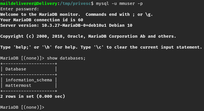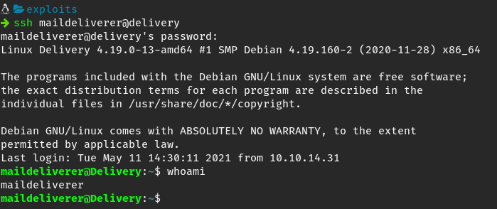 Using the clear text credentials found on MatterMost we can now login via SSH as the user maildeliverer.