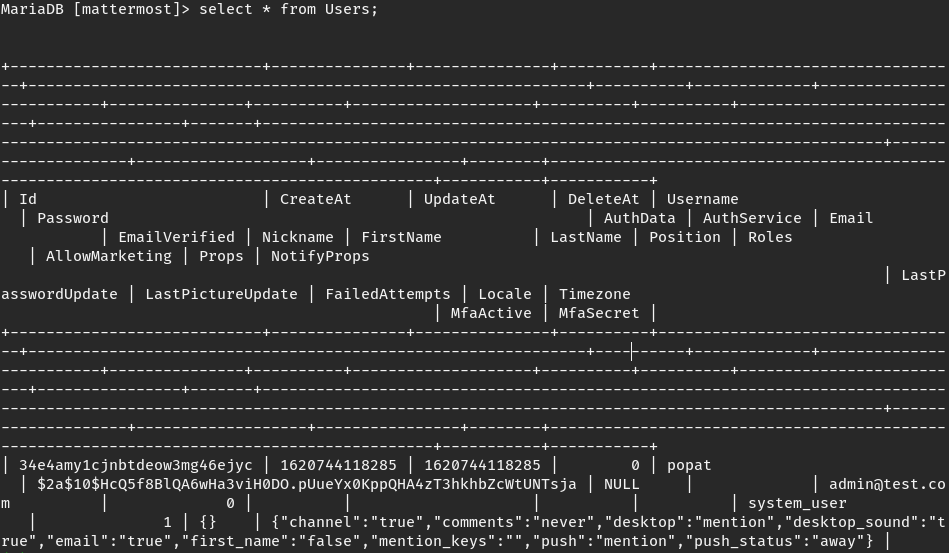 After some preliminary checks I visited the config directory of MatterMost in /opt/mattermost. An interesting file is found inside config folder of the MatterMost directory called config.json. In this the password to MatterMost’s database is written in plain text.